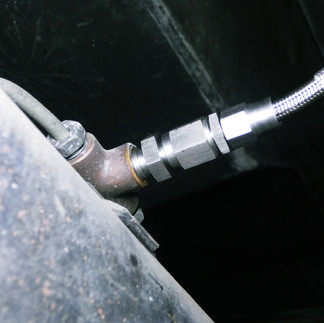 ホースは現物から合わせて切っている状態です。写真上に見える両方にネジが切ってあるのが、車体とホース、キャリパーとホースをそれぞれ繋ぐためのバルクヘッドとコンデッサ(アダプター)